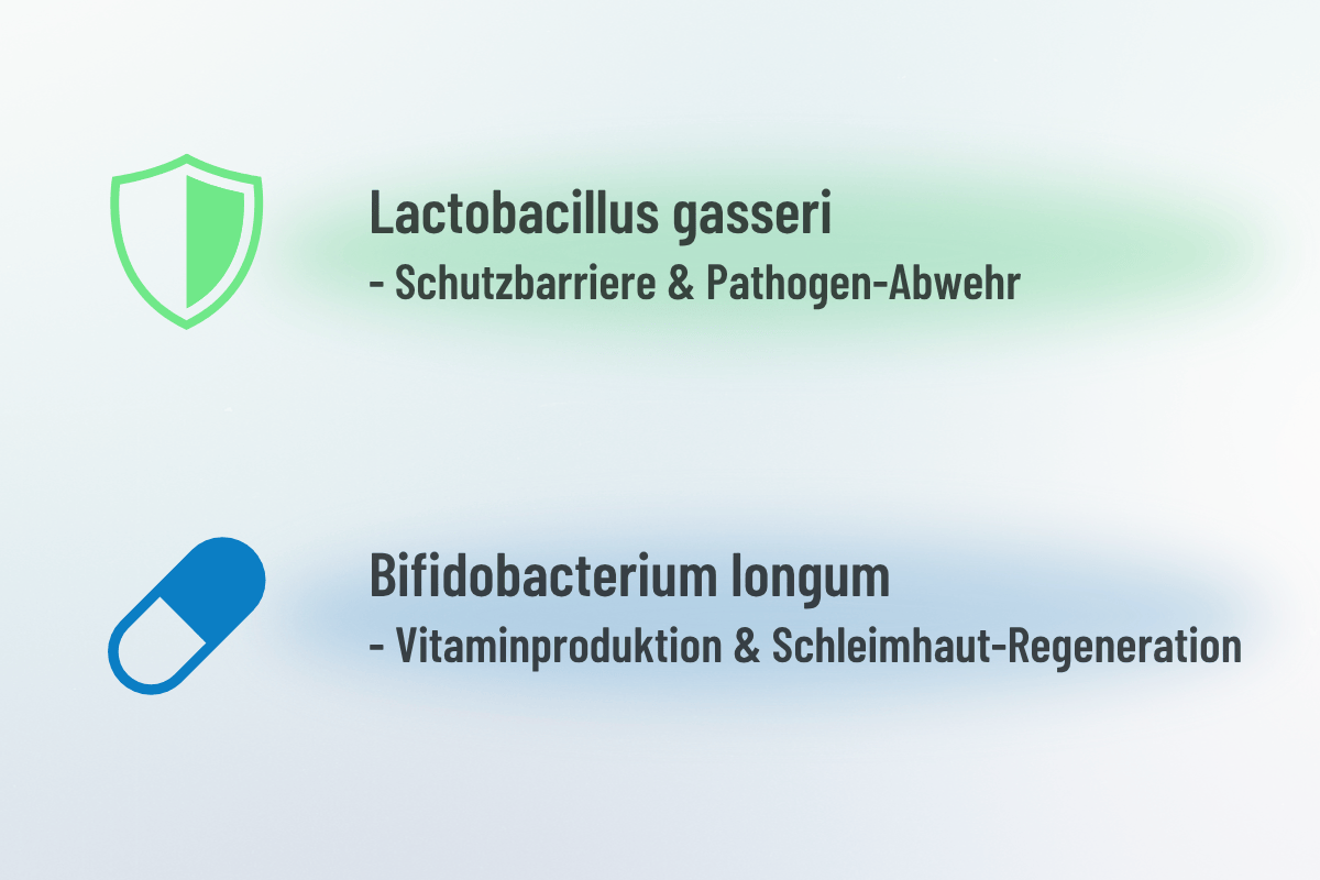 Die Kombination aus Lactobacillus gasseri und Bifidobacterium longum deckt sowohl Dünn- als auch Dickdarm ab – genau dort, wo Antibiotika den größten Schaden anrichten.